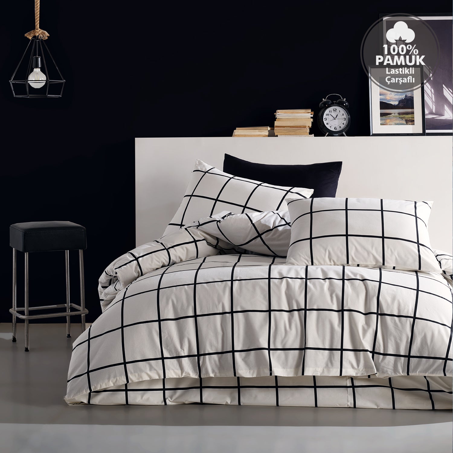 Karo Siyah %100 Pamuk Battal Boy Lastikli Çarşaflı Nevresim Takımı